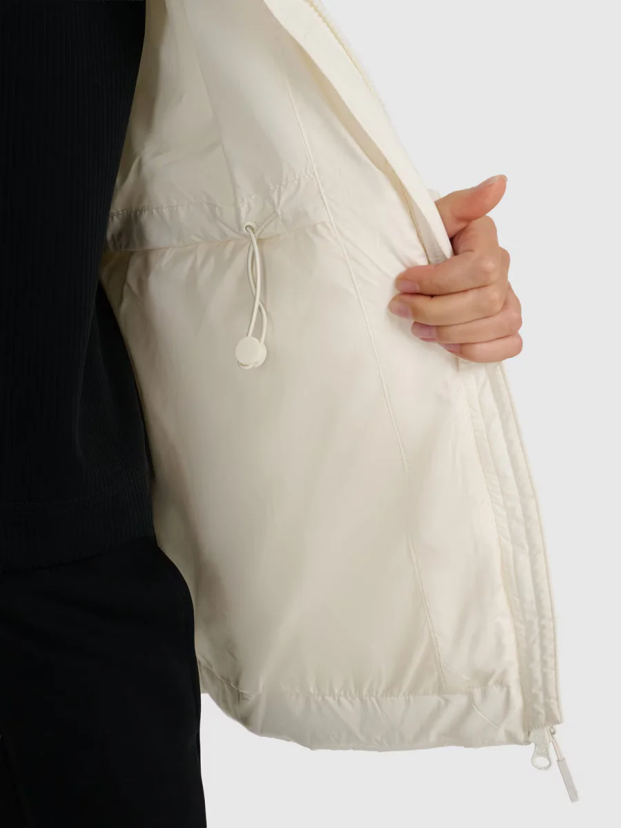 Niska stójka osłania szyję, a gumki w mankietach i regulacja w pasie dbają o dopasowanie i komfort termiczny. 2 kieszenie na zamek pozwalają schować drobiazgi lub ogrzać dłonie – funkcjonalny wybór na chłodniejsze dni.