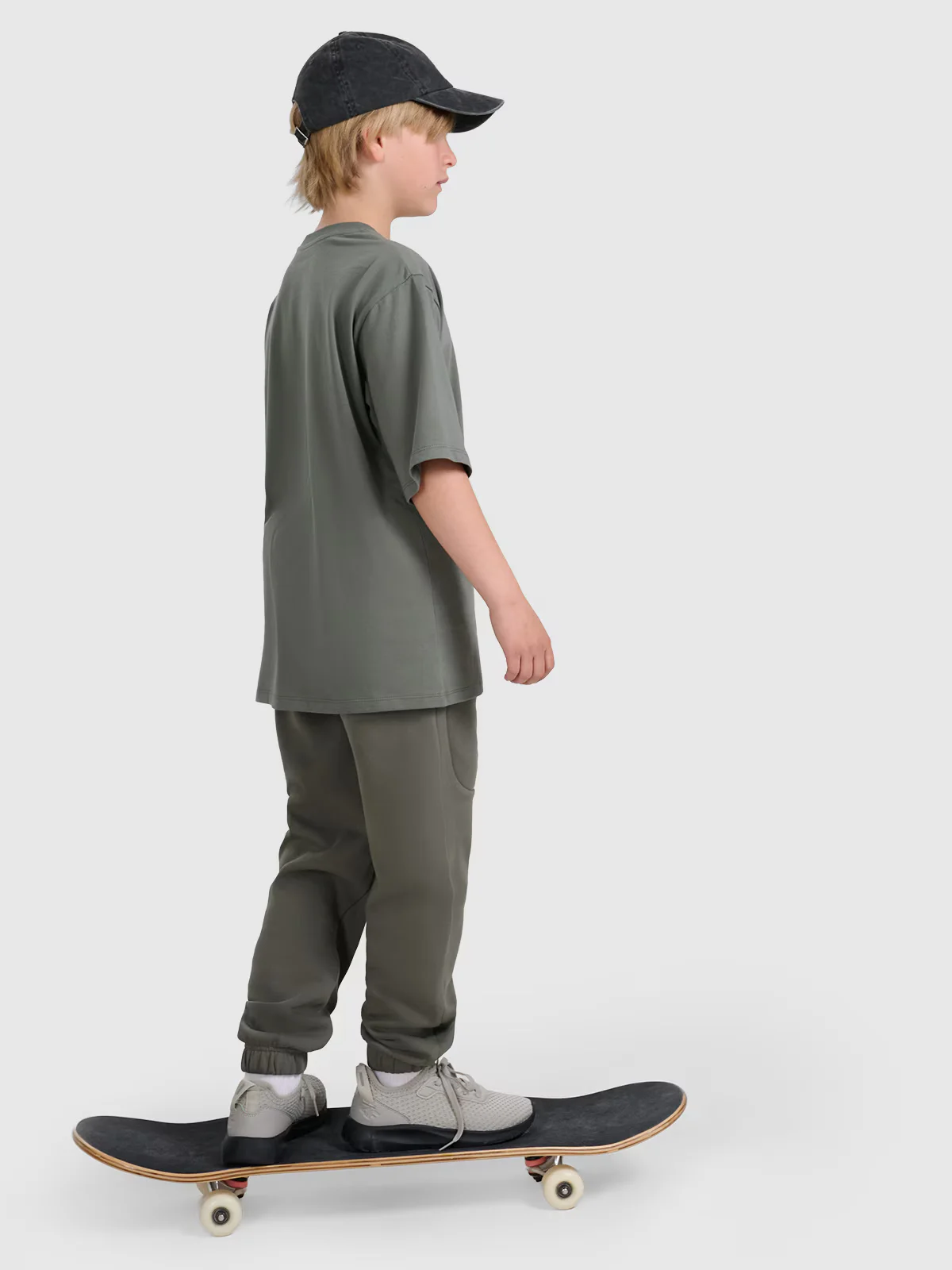 Spodnie dresowe joggery chłopięce idealnie sprawdzą się jako element zarówno casualowych, jak i sportowych stylizacji na co dzień. Posiadają krój loose, który swobodnie układa się na ciele oraz zwężane nogawki zakończone elastycznym ściągaczem.