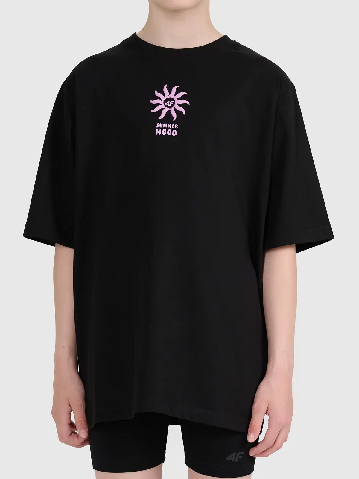 Dziewczęcy T-shirt 4F JUNIOR to baza garderoby na każdy dzień. Prosty krój z małym nadrukiem sprawdzi się zarówno do szkoły, jak i na czas wolny.